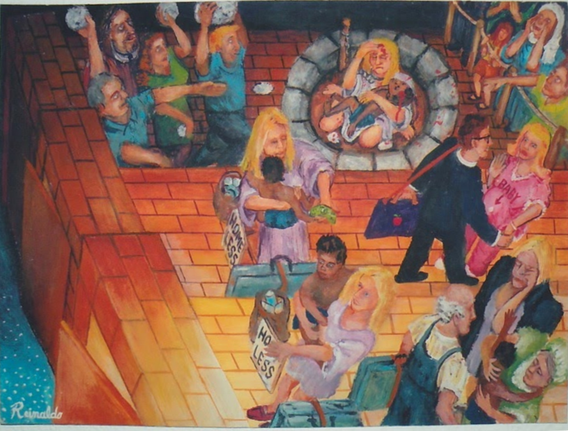 The blond lady with black baby = Doors of compassion. In America when a white woman is left alone with a black baby she is condenned and stoned to death in their hearts (no compassion, door is closed). In the second door a little compassion some give her a little money but no help. The greates love shown to her is from a stranger older couple who take her home and care for her. The more compassion more love.