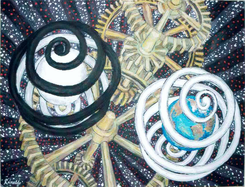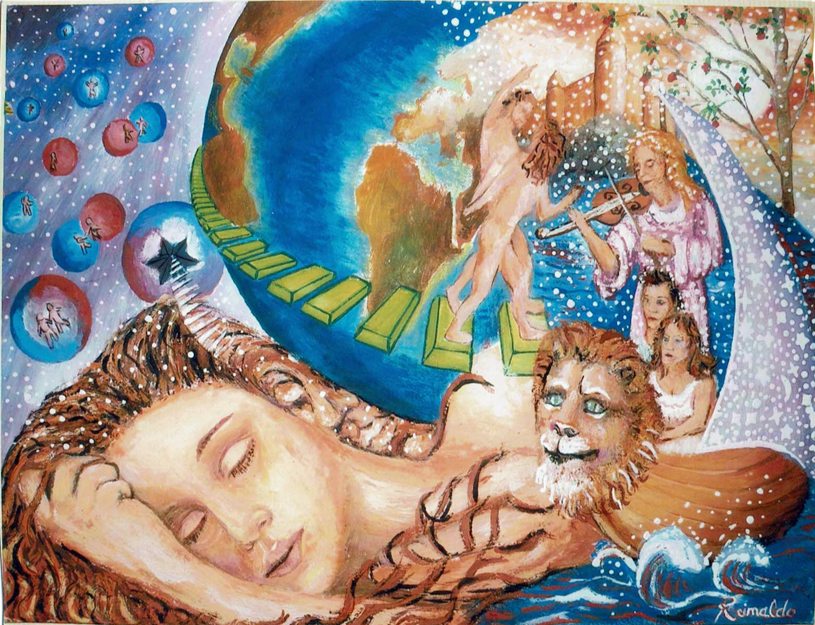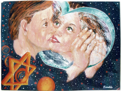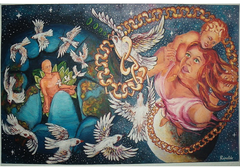 I am sitting in the earth and there is a women with child standing on the moon. The birds are peace and the heart chain is love. When these come together they sing and cryout to our father in pure joy and love.