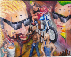 Man and women with black glasses is called „Teenager Wasteland“ like a song. The glasses are virtue reality each one is playing a game, the man likes sex and motorcycles, she is a warrior and fights against bad guys while she is protecting a little girl. Sex and violence is what is on